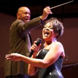 Pianist Gerald Clayton. Zangeres Shirma Rouse met op de achtergrond John Clayton, dirigent van het Metropole Orkest. Kurt Elling zijn dankwoord was te zien op een videoscherm.