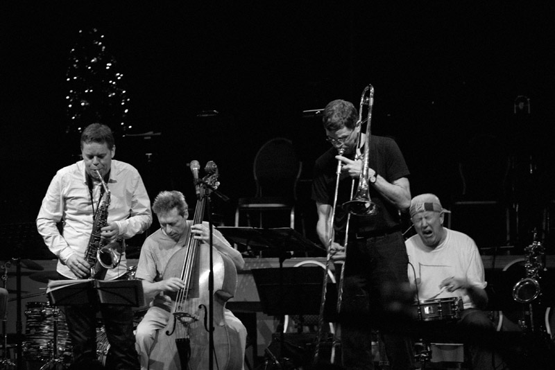 Ray Anderson pakte nóg eens uit in een rumba van eigen hand. Een nog veel langere solo, geheel via circulerende ademhaling neergezet met uitbundig gegoochel met dempers, betoverde het dolenthousiaste publiek. Toen de overigen invielen, werden er afwisselend dotten gas gegeven en vol op de rem getrapt, waardoor dit muzikale vehikel met de neus naar beneden door de concertruimte stoof.