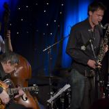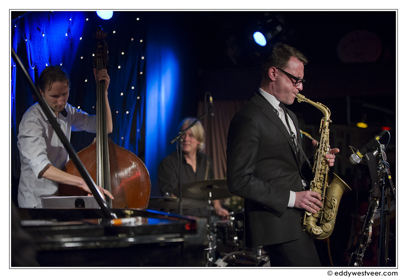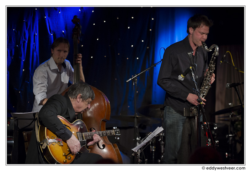 De heren waren in het kader van ‘Dutch Songbook’ al eerder met elkaar op pad. Van deze samenstelling bleef vervolgens alleen Van der Feen zitten en bij hem voegden zich gitarist Philip Catherine en basklarinettist Joris Roelofs. Op het repertoire stonden onder meer de standard ‘Like someone in love’ en Roelofs’ ‘Easy going‘. Het gelegenheidstrio creëerde een warme sfeer. Roelofs liet in zijn eigen trio met Matt Penman al eerder horen dat de combinatie basklarinet en contrabas goed werkt. Catherine is natuurlijk een meester-gitarist. Smaakvol rijgt hij zijn akkoorden aan elkaar en verweeft die met melodische lijnen, niet zelden middels snelle tokkelpartijen. Prachtig hoe hij varieert met allerlei kleuren. Met name in Parker’s ‘Anthropology’ bracht Catherine ook elementen uit de gipsystijl in.