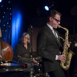 Tenslotte verzamelden alle muzikanten zich op het podium. Het jonge talent Yoran Aarssen (19) uit Hulst mocht meespelen en deed dat niet onverdienstelijk. ‘Night in Tunesia’, volgens Menu jarenlang ten onrechte zo genoemd want het moest toch echt zijn ‘Night in Terneuzia’, vormde de springplank voor een lange reeks improvisaties. Met zijn allen op een podium, dat inspireert. Naast de extatische solo van Herman stond een percussieve improvisatie van Joris die daarin veel speelde met ruimte. En terwijl Menu zijn baritonsax dit keer wat meer liet bulderen, kwam Catherine met een weefwerk waarin bluesy en melodische Djangolicks afwisselden met brede akkoorden en dito harmonieën.