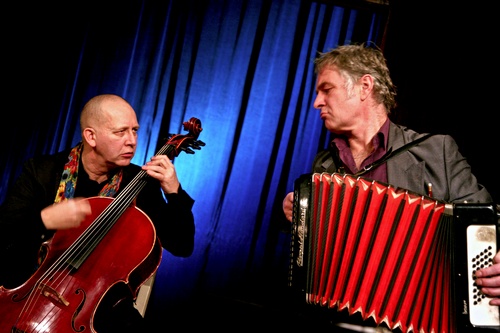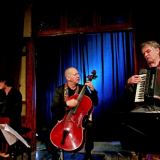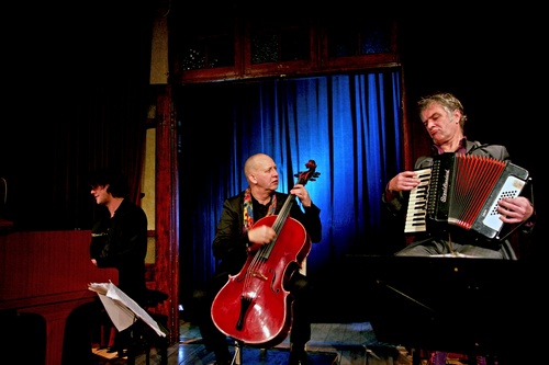Ernst Reijseger, Wolfert Brederode en Felix Strategier tijdens de reprise van 'Klaarlichte Nacht' in de Roode Bioscoop.