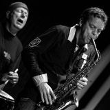 Han Bennink en Paul van Kemenade op het doek en op het podium. Foto © Stef Mennens / Drieluik.