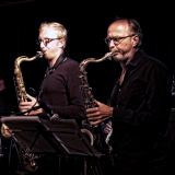 Tenorsaxofonisten Steven Delannoye en Bart Defoort. Teun Verbruggen en Kobe Proesman. Bandleider Bruno Vansina.