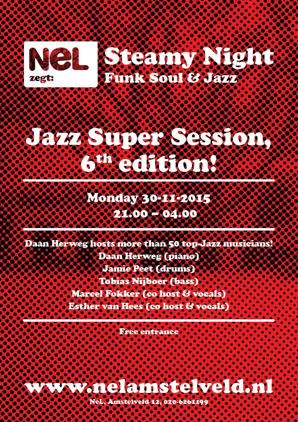 18 nov - De wekelijkse maandagavond jazzsessies in Café Nel in Amsterdam zijn zowel bij publiek als muzikanten populair. Jaarlijks komt dat extra tot uitdrukking in de Jazz Super Session die tot diep in de nacht voortduurt en waaraan zo'n 50 musici deelnemen. Op maandag 30 november is het weer zo ver.