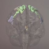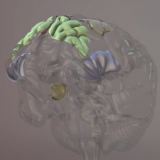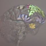 Stills uit de 3D-animatie*. Blauw/paars: taalgebieden voor ritme. Geel: ideeën. Groen: samenspel. Paars en paarsbruin: complexe handelingen, motorische gebieden voor o.a. motorische controle.