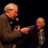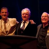 Locoburgemeester Simone Kukenheim met op de achtergrond Schrama en Frank Jochemsen. Peter en Marius Beets met Ineke. Alle vrienden op het podium van Bimhuis.