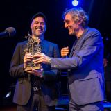 Martin Fondse krijgt de Buma Boy Edgarprijs uitgereikt door Wim Vos, geflankeerd door cellist Jörg Brinkmann en de Braziliaanse singer-songwriter Lenine.