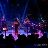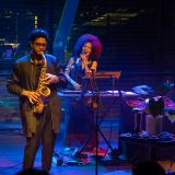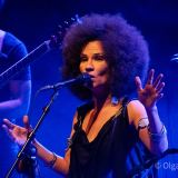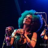 Het is dan ook niet vreemd dat het Bimhuis een podium geeft aan Oum, een zangeres die rechtstreeks voortkomt uit de Marokkaanse roots muziek. In 2015 gooide ze wereldwijd hoge ogen met haar album ‘Zarabi’, muziek die rechtstreeks ontstaan lijkt in de woestijn. De zaal is gevuld met hartstochtelijke fans en vooral heel veel vrouwen, al dan niet gesluierd. Het is duidelijk dat er een nieuwe doelgroep is aangeboord, die vanaf de eerste seconde de muziek van Oum gretig indrinkt. In haar concert staat haar laatste album ‘Daba’ (Arabisch voor ‘nu’) centraal. Een productie die in tegenstelling tot haar eersteling meer een fusion karakter draagt. Saxofonist Carlos Mejiias Nuevas Perez maakt veelvuldig gebruik van elektronische samples en loops. Trompettist Camille Passeri is vooral druk met zijn effectpedalen en bassist Damian Nuevan lijkt zo uit een jazzrock formatie te zijn gestapt. Ud-speler Yacir Rami refereert in zijn spel nog het meest aan de authentieke woestijnmuziek.