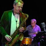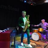 Tenorsaxofonist Rolf Delfos, Hammond-organist Frank Montis en drummer Pim Dros op het podium van FarmStead Jazz Club in Westbroek.