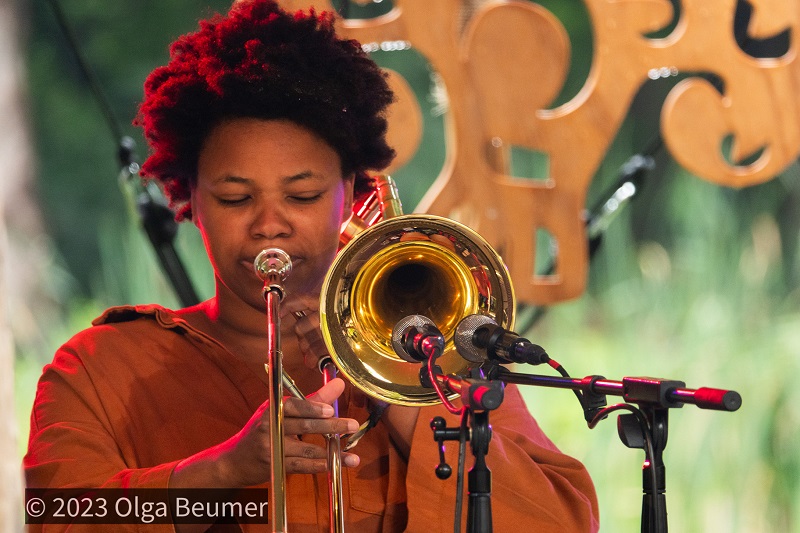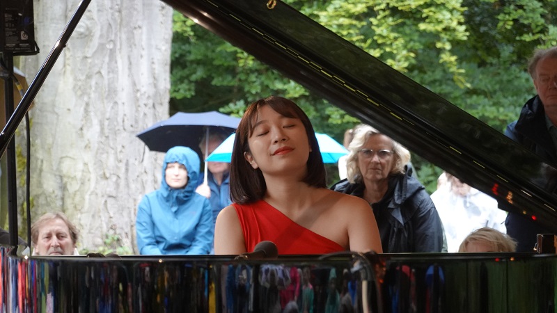 De weergoden spelen behoorlijk op tijdens het begin van de tweede festivaldag. Het geluid van de harde regen gaat een wrede confrontatie aan met het concert van violist Niek Baar met celliste Ella van Poucke en pianist Ben Kim. Bij het recital van de Belgische tromboniste Nabou Claerhout met zangeres Lynn Cassiers is het weer droog, maar het optreden van de dames gaat ten onder in een overdosis elektronica. In de buitenruimte gelden nu eenmaal andere spelregels en zijn soundscapes alleen maar gedoe. Een minder moment dat enigszins wordt goedgemaakt door het ‘Delirium voor vier vleugels’ van de Oekraïns-Nederlandse componist Maxim Shalygin. Muziek die meditatief begint en vervolgens steeds meer in kracht toeneemt.