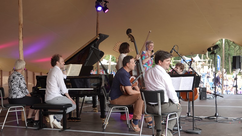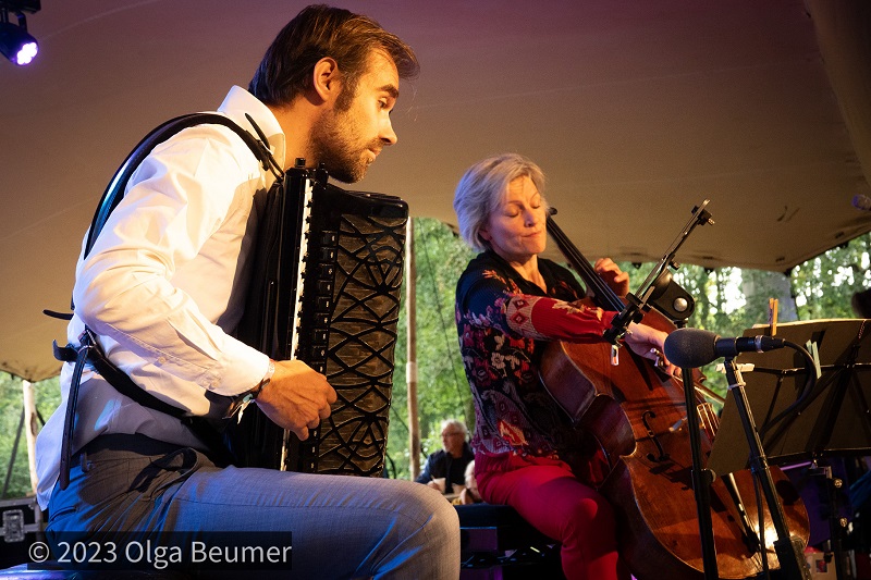 Accordeonist Vincent van Amsterdam en celliste Quirine Viersen. Wonderfeel Festival Orchestra. Pianiste Saskia Lankhoorn.
