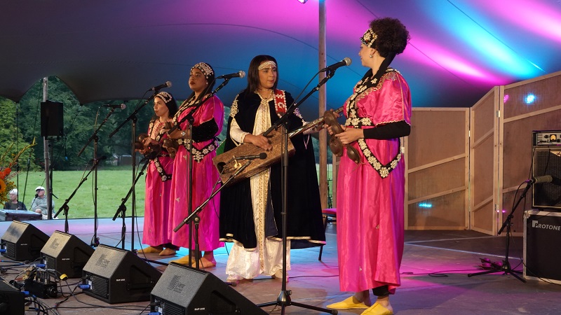 De Marokkaanse Asmâa Hamzaoui met haar vrouwengroep Bnat Timbouktou. Publiek geniet van Nabou Claerhout. ‘Delirium voor vier vleugels’ van componist Maxim Shalygin.