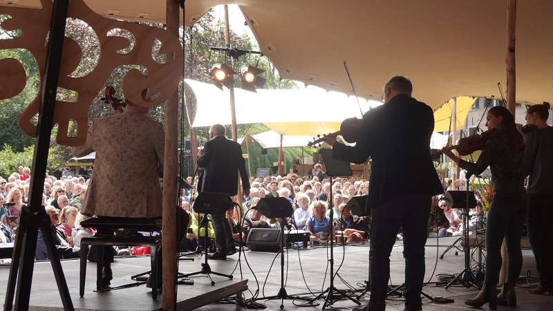 Basklarinettist Joris Roelofs geeft een solo-optreden waarin hij zijn spel combineert met opvattingen over improvisatie door de eeuwen heen. Uitermate sterk is het concert van het Artvark saxofoonkwartet op de charmante Bosplek. Met hun organische ensembleklank weten ze ook de liefhebbers van klassieke muziek te overtuigen. Dat het niet vanzelfsprekend is dat Turkse muziek en barok met elkaar te combineren zijn, horen we even later bij Musica Sequenza waarbij blijkt dat de stemming van oosterse en westerse instrumenten zodanig verschilt dat het ensemblegeluid verre van zuiver is.