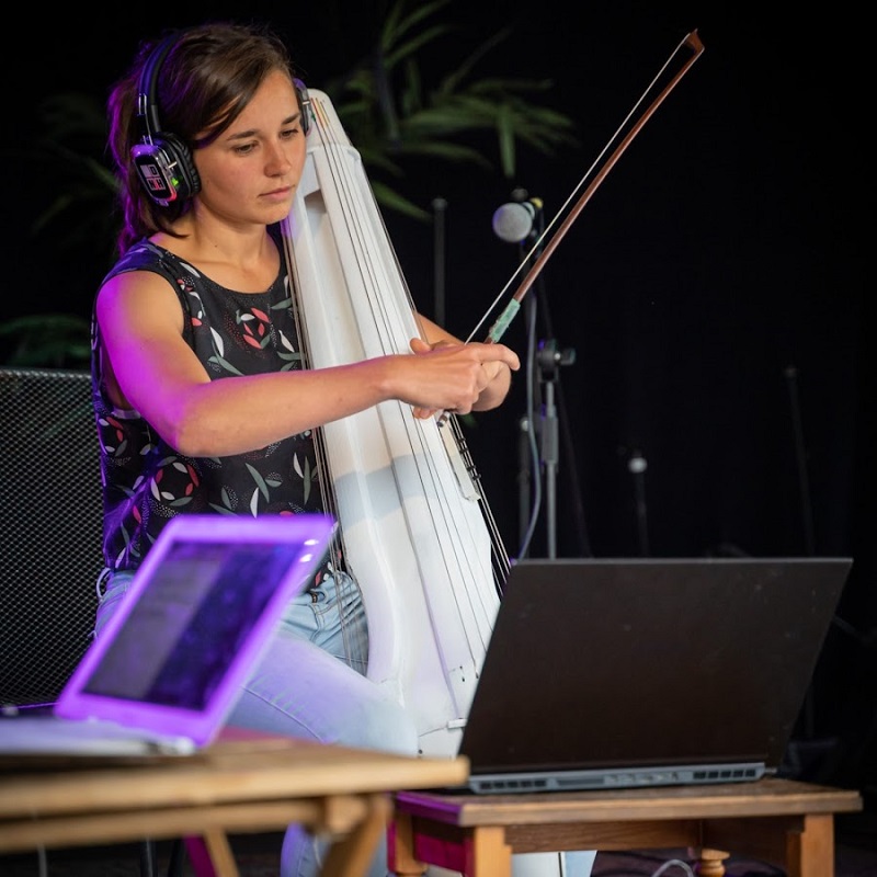 Rafaele Andrade met haar zelf ontworpen snaarinstrument Knurl.