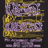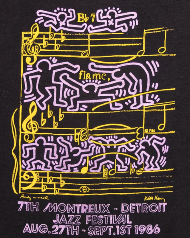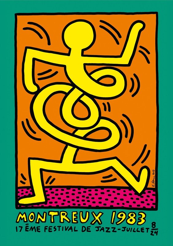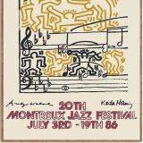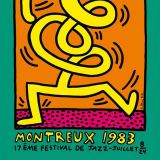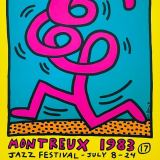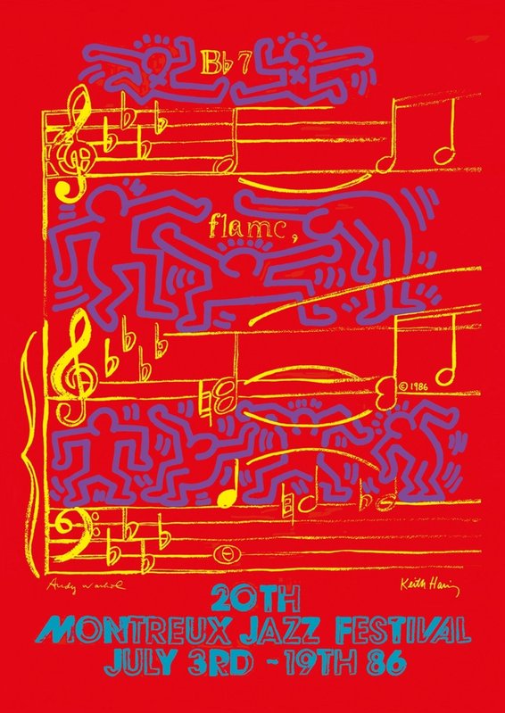 In 1986 nodigde het Montreux Jazz Festival de kunstenaar nogmaals uit om een poster te ontwerpen, ditmaal in samenwerking met popart godfather Andy Warhol (1928 – 1987). Toen Pierre Keller op de afgesproken datum naar Amerika reisde om het resultaat te bekijken bleek er nog niets op het doek te staan. In allerijl werd Warhol opgetrommeld om een paar notenbalken te schilderen waar Haring ‘on the spot’ zijn mannetjes tussendoor liet dansen. Hoe jazz wil je het hebben? Ook dit ontwerp kreeg Keller in drie kleurvarianten mee. Op de terugweg ontdekte de artistiek adviseur dat de verbluffend geslaagde schilderijen nog niet gesigneerd waren. Een dag later stuurden Warhol en Haring hem alsnog hun handtekeningen toe.
