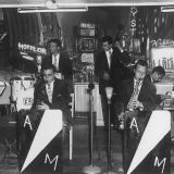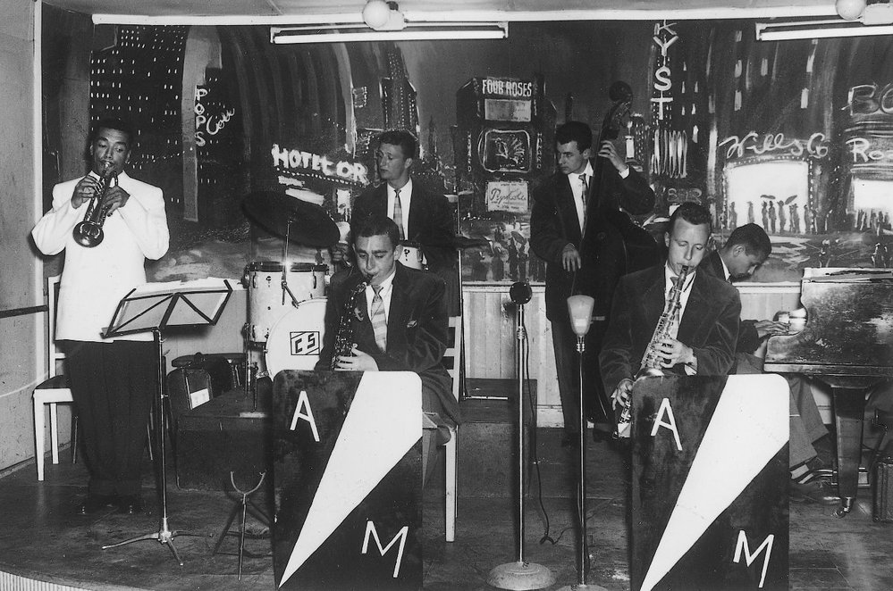 Sandy Mosse (linksvoor, met tenorsax) in de band van Ado Moreno, ofwel Ado Broodboom in Zweden, 1954. © Collectie Ado Broodboom, NJA/Allard Pierson.