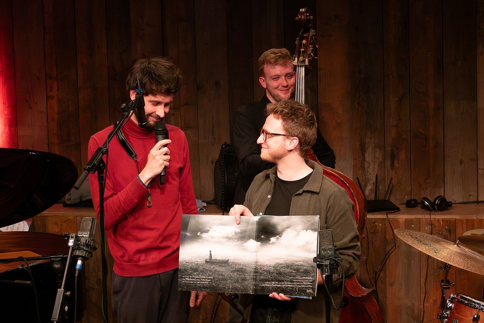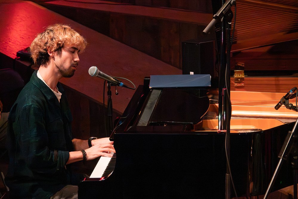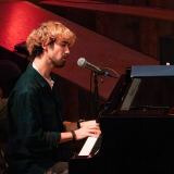 Pianist Aseo Friesacher. Het album 'Seafarer' wordt getoond aan het publiek.