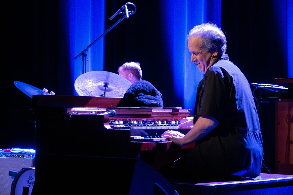 Gitarist Peter Bernstein, slagwerker Bill Stewart en Larry Goldings achter de Hammond in het Rotterdamse podium LantarenVenster.
