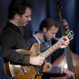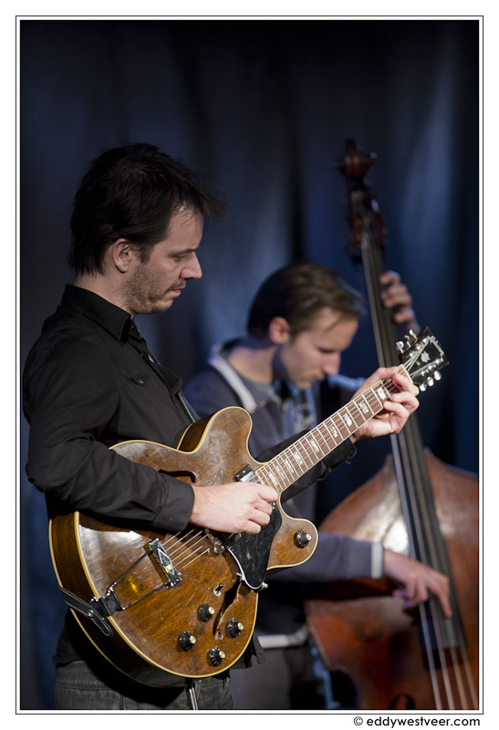 Het trio oogde ontspannen in Terneuzen. Op het podium vond regelmatig kort overleg plaats over de volgorde van de nummers en ook de invulling er van. En die invulling, die is steeds bijzonder. Of de heren nu Cole Porter’s ‘Everytime we say goodbye’ of Van Ruller’s ‘Circles’ van diens gelijknamige album uit 2003 vertolken, men is wars van herhaling van zetten. Live klinkt Porter’s stuk bijvoorbeeld al een stuk anders dan op het album en ‘Circles’ kreeg een behandeling speciaal voor het trio. De musici zoeken telkens naar nieuwe interpretaties. De vorm die het gezelschap koos leunt op intensief samenspel en individualistische grootspraak is dan niet op zijn plaats. Van Ruller was veelvuldig het bindmiddel met zijn spel waarbij rake akkoorden subtiel overgaan in losse lijnen en weer terug. Hij bouwde steeds een raamwerk waarin zijn partners hun begeleiding of solo’s, waarvoor ook Van der Feen veel ruimte kreeg, konden plaatsen. En, de gitarist heeft altijd interessante aanvullingen in petto: het gesyncopeerd achter Roelof’s thema lopen in diens ‘August 30’ of de tegen de country aanhikkende fingerpicking riffs in ‘Cow daisy’. Daarin experimenteerde Van Ruller in de solo overigens flink met wat harmonisch binnen de grenzen van het akkoordenschema paste.