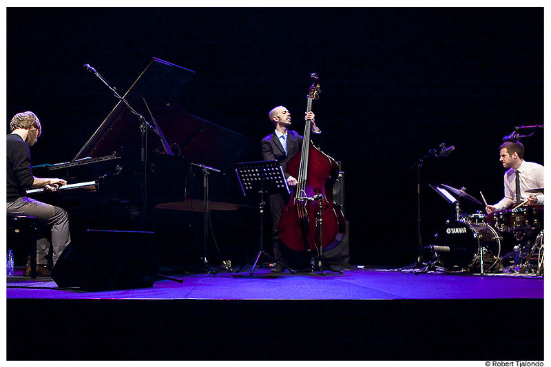 Trio Aaron Parks, Matt Brewer, Craig Weinrib tijdens het concert in Lantaren Venster in Rotterdam.