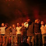 De voltallige bezetting van Kytecrash bedankt het publiek in P60, met toetsenisten Niels Broos en Jeroen van Vliet.