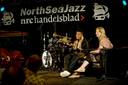 Muziekjournalist Amanda Kuyper ontvangt tijdens NSJ in het NRC Jazzcafé musici voor interviews, zoals Christian Scott in 2010.