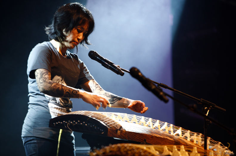 Een paar uur voordien hadden we gelukkig het tweede onverwachte hoogtepunt van het festival gezien: de Japanse Michiyo Yagi met haar double trio gevormd door twee bassisten en twee drummers. Yagi bespeelt de 17-snarige en 21-snarige koto, een traditioneel Japans instrument waarvan je de harpverwante klank meteen herkent. In deze constellatie echter geen traditionele muziek of zen-verwante bespiegelingen maar puur vuurwerk. Van dubbele drumsolo’s tot spacy progrock, het suisde allemaal voorbij. Een adembenemende vertoning en hopelijk zo snel mogelijk terug op een podium in de buurt.