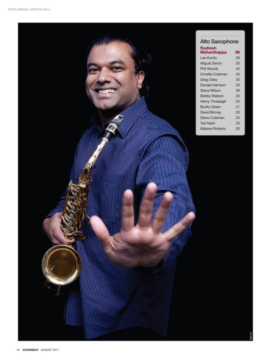 1 jul - Rudresh Mahanthappa is door Downbeat Critics Poll 2011 uitgeroepen tot beste altsaxofonist. Mahanthappa tekende deze maand een platencontract bij ACT Music en heeft op het komende North Sea Jazz Festival een driedaagse 'Carte Blanche'. Lee Konitz en Miguél Zenon werden tweede en derde in de door jazzjournalisten opgestelde Critics Poll.