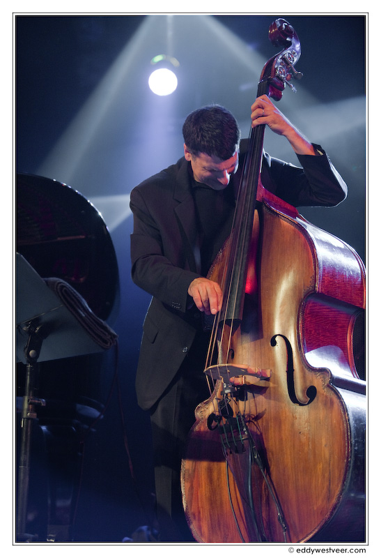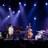Het kwartet van Jeroen Van Herzeele bedankt het publiek. Ahmad Jamal imponeerde. Contrabassist John Pattituci.