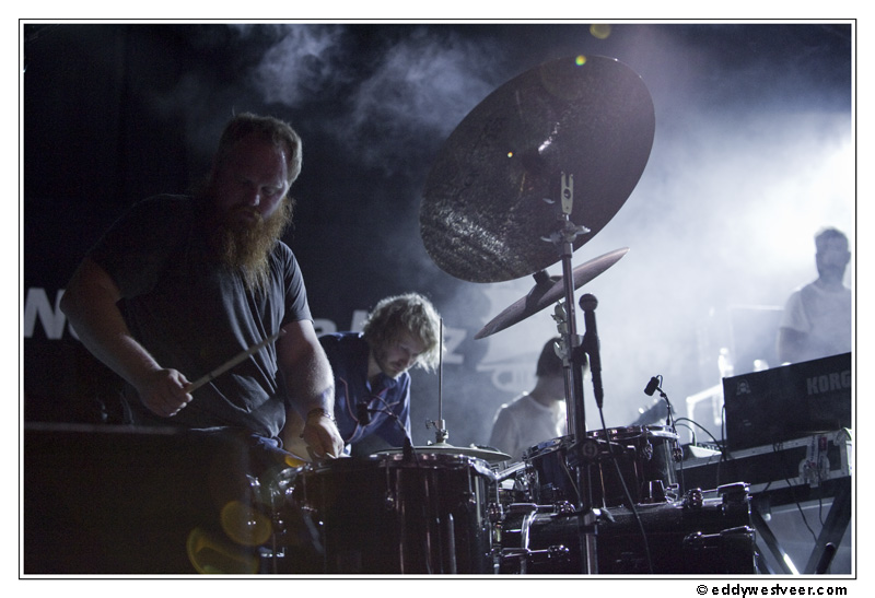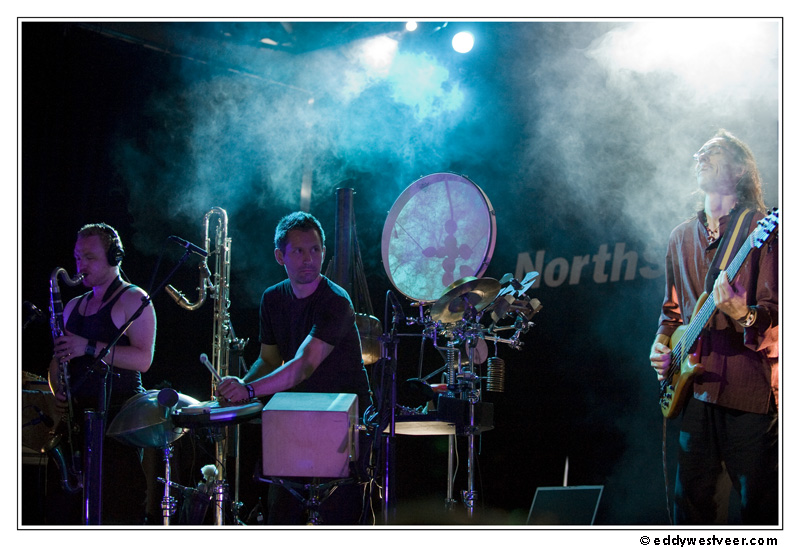 Totaal anders is de aanpak van Jaga Jazzist. In de Yukon, waar de nieuwe fusion onderdak vond, gaven de Noren een opwindend optreden dat zich naadloos voegde naar de opbouwende euforische spanning voor de steeds dichterbij komende voetbalfinale. Onder aanvoering van drummer Martin Hornveth (was zijn baard oranje of leek dat maar zo?) bracht de band een sterke set waarin invloeden uit jazz, rock, dance en minimal music tot een enerverend amalgaam werden gekneed. Het volume werd soms flink opgeschroefd om de opwinding nog wat te vergroten, maar Jaga Jazzist hoeft het niet per se van die geluidsmuur te hebben. Met sterke solisten als trompettist Matthias Eick in de gelederen wordt er een hoog spelniveau gehaald. Bovenal zijn echter de composities heel krachtig. De groep schuift verschillende ritmische figuren over elkaar waardoor er een groove ontstaat die uiteindelijk minder complex is dan hij lijkt, maar die wel een broeiende energie in de muziek laat stromen. Daaroverheen worden heldere melodielijnen gelegd die waar nodig worden dichtgemetseld door gitaar en toetsen. Het klinkt live allemaal net een tikkeltje spectaculairder dan het is en heeft toch genoeg om het lijf om boeiend te blijven. Perfecte festivalband.