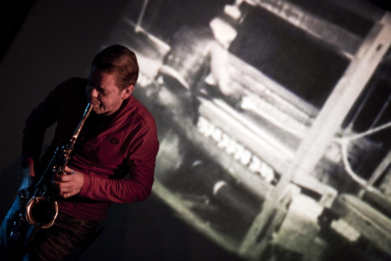 Een duet tussen altsaxofoon en piano leek op het uitproberen van een nieuwe compositie; aan elkaar gemonteerde momenten uit de film ‘La Bête Humaine’ uit 1938 (met acteur Jean Gabin) lieten de werkzaamheden zien van een stoker en een machinist op stoomlocomotief 23-532 in de buurt van Le Havre. Peter Hofland leek zijn enorme AH-tas vol elektronica hier op zijn kop te zetten en creëerde er een hoogtepunt van de avond mee. De ter ziele gegane wollenstoffenindustrie van Tilburg werd indringend tot leven gewekt met fascinerende beelden van werkende weefgetouwen en spinmachines. De piano volgde de stampende machinerie op de voet, Peter Hofland versterkte de mechanische ritmiek met muzikale impulsen en de altsaxofoon bond het geheel met etherische lijnen samen.