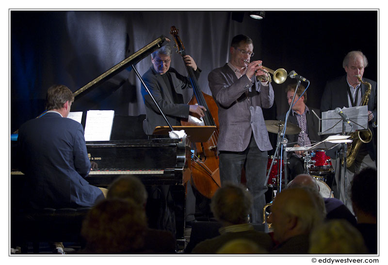 Met 'Tail wind', een nieuwe compositie van trompettist John Marshall, trok het kwintet meteen van leer. Up-tempo bouwden de twee blazers de thema's in mini-bigband stijl op. Puntige geharmoniseerde thema's zetten de toon voor de solo's. De snelheid en intensiteit daarvan suggereerden een zekere vanzelfsprekendheid, zoals vaak gedurende dit concert. Echter, hoewel dit geen mannen van veel uiterlijk vertoon zijn - ze laten de instrumenten spreken - verraadde de lichaamstaal voor of gedurende de improvisaties, dat weinig vastlag maar daadwerkelijk ontstond in het moment. In 'Marshall arts' bijvoorbeeld, een compositie van pianist Rob van Bavel, leek Povel even te zoeken om in de flow te komen. Hij pauzeerde wat langer hier en daar en vertrok dan weer op avontuur. Na afloop vouwde hij de handen om de saxofoon en sloot de ogen even alsof hij de lijnen overdacht. Een knikje volgde. Hij leek tevreden.