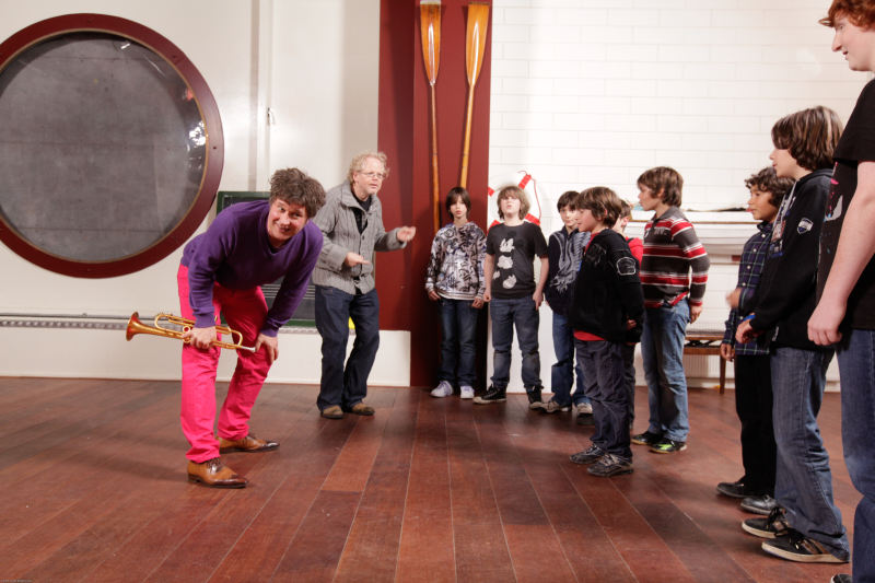 De eerste kennismaking met improvisatie vordert. Eric Vloeimans blaast een noot en zegt tegen een van de jongens: “Jij antwoordt mij.” Dat gebeurt prompt, waarop Eric lachend zegt: “Gefeliciteerd. Je hebt je eerste improvisatie gedaan.” En dan, het kan natuurlijk niet uitblijven, moet de eerste naar de wc. Korte pauze derhalve.