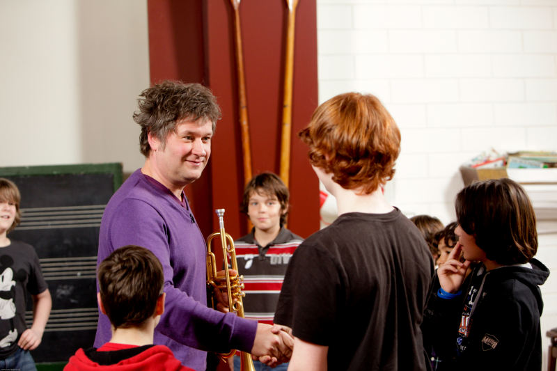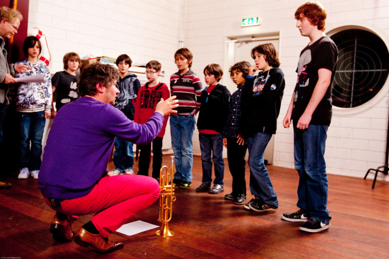 En dan is het voorbij. “Vonden jullie het leuk?” vraagt Eric Vloeimans. Ja, knikken de jongens. “Vonden jullie het moeilijk?” Geen antwoord. “Ik vond het ook eng, hoor. Het valt niet mee, maar als je eenmaal bezig bent, wordt het gemakkelijker”, blikt de trompettist vooruit naar wat nog komen gaat.