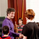 Inmiddels is Eric Vloeimans met zijn trompet er bij komen staan. “Geert, mag ik even een E-tje van jou?” vraagt hij aan de dirigent, die zich naar de piano haast. En Carlo Balemans: “Eric gaat ook op die E beginnen en dan zien we wel wat hij verder doet.” Waarop Eric Vloeimans de trompet aan zijn mond zet en zichzelf meteen corrigeert: “Ojee, ik zit verkeerd met m’n ladder. Een notennaam is maar een notennaam. Nu gaat het om het gevoel. Deze toonladder hoor ik. Of het die of die noot is, doet er niet zo toe.” De jongens knikken wederom vol begrip.