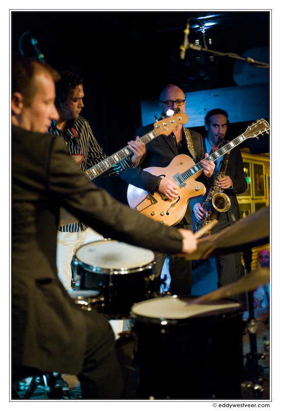 Tenslotte is er de humor. Subtiel, zoals bij de speldenprikken die drummer Martijn Vink soms uitdeelt. Of meer direct, bij de aankondigingen van Goudsmit en zijn kenmerkende mimiek. Van ‘The pig’s eye popsuckle’, al heel vaak gespeeld, is inmiddels de verrassing bekend: het fluisterende funky blueslickje, dat hoegenaamd vanuit het niets uitbarst in een krijsende solo op orkaanniveau. Maar Goudsmit is met een arsenaal schijnbewegingen elke keer weer in staat toch de spanning op te bouwen en de uitbarsting uit te stellen. Op het moment dat het publiek helemaal het stuk ingezogen is knalt die er pas uit.