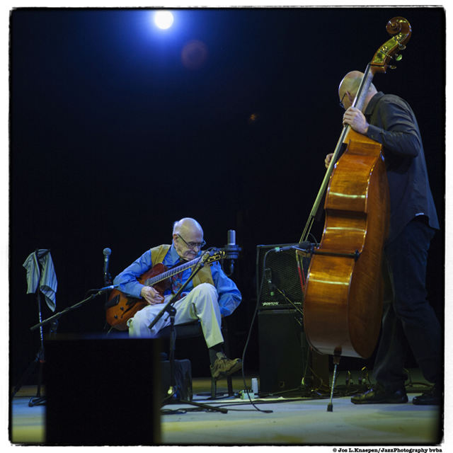 Een ander icoon uit de jazz is gitarist Jim Hall. Hij is inmiddels 81 jaar. Na zijn concert in Gent moet worden geconcludeerd, dat het beste er bij hem af is. Hall speelde vooral veel akkoorden met over het algemeen een vrij krachteloze aanslag. Hierdoor hoorde je het plectrum slap langs de snaren glijden, wat een onaangenaam, plastic geluid teweeg bracht. Contrabassist Scott Colley deed het heel wat beter, maar in zijn eentje kon hij het duoconcert niet redden. Je vraagt je in arren moede af of het nodig is dat je moet horen hoe een 81-jarige nog gitaar kan spelen. Liever niet, zou je zeggen.