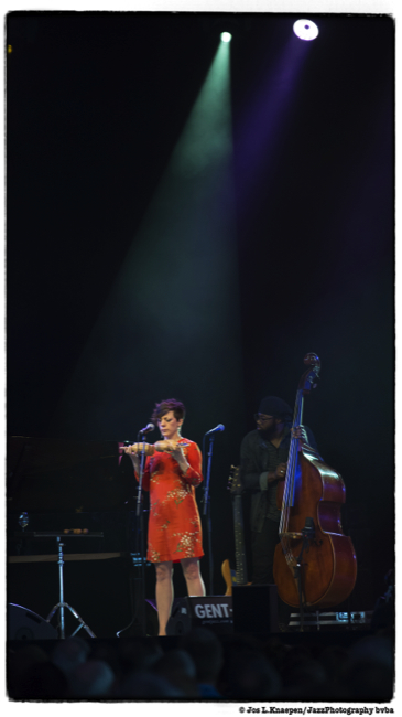 Gretchen Parlato tekende voor een van de topconcerten van Gent Jazz. De Amerikaanse zangeres is zonder meer een persoonlijkheid op het podium, maar meer nog onderscheidt zij zich van andere jazzvocalisten door het gebruik van haar stem. Haar keel is het epicentrum van haar stembanden, dáár gebeurt het allemaal. Haar spraakorgaan waart eerst rond in de keelholte, voordat de stemklanken Parlato’s mond verlaten. Bovendien beheerst zij een afwijkende ademtechniek, waardoor je goed kunt horen hoe ze haar levenslucht onderdeel maakt van haar vocale verrichtingen.