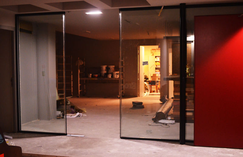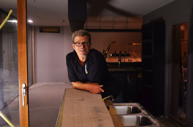 Glazen doorzicht naar het nieuwe café. Het podium van Paradox is nog onzichtbaar vanwege de bouwmaterialen. Hoofdprogrammeur Bartho van Straaten aan de nieuwe, nog af te werken bar van Paradox. Foto's © Gemma Kessels.