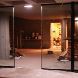 Bartho van Straaten (l) en Paul Guldemond sjorren aan de glazen afscheiding tussen concertzaal en café. Foto © Gemma Kessels.