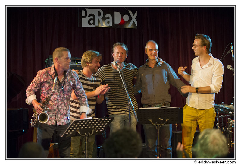 Bram Stadhouders improviseert. Het Paul van Kemenade Quintet bedankt het publiek.