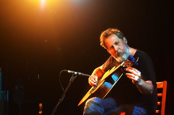 Bill Orcutt had slechts een akoestische gitaar tot zijn beschikking. Eenzaam op een stoel op het podium gezeten, op blote voeten, leek hij zijn inspiratie te hebben gehaald uit Amerikaanse folkmuziek. Dáár lag namelijk de nadruk met zijn nadrukkelijke rechterhand. Na elke zes, zeven noten volgde een klap met die hand. Orcutt neuriede uitbundig mee, speelde gebroken akkoorden én gebroken tempi en ritste de ene na de andere intrigerende improvisatie aaneen.