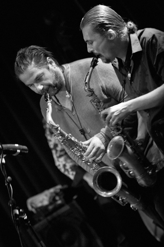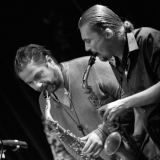 De twee saxen klonken voorbeeldig. Ze produceerden een compacte swing. Soms bogen ze naar New Orleansjazz en dan weer naar blues, maar immer keek Coleman over de schouders mee. Ook visueel was er heel wat te genieten: de beer Mete Erker die het Coltranegeluid dat zijn spel jarenlang kenmerkte voorgoed achter zich heeft gelaten en zich tot een straffe persoonlijkheid op de tenorsaxofoon heeft ontwikkeld. En daartegenover Joris Posthumus, die springerig en zelfbewust heen en weer bewoog tussen de nerveuze erfenis van Charlie Parker en Ornette Coleman himself. Kortom twee saxofonisten die door hun durf en vakmanschap onbevangen het Colemanmateriaal te lijf gaan én naar hun hand zetten.