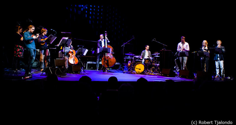 De voltallige bezetting van Stephanie Francke's The Nine, met daarin trompettist Leonard Evers. New Cool Collective.