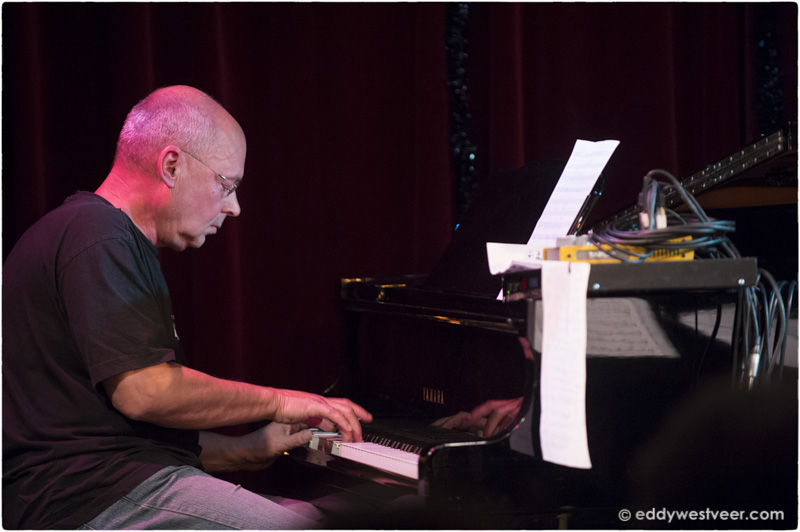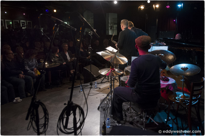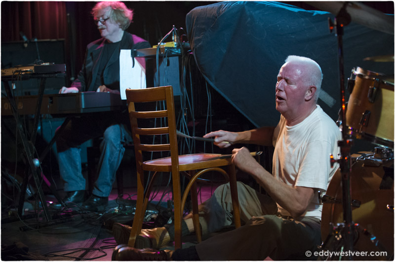 Waardoor de piano een voortdurende melodische onderstroom produceerde, die nauw aansloot bij de oerkrachten die Han Bennink losmaakte. En hoewel Louis van Dijk het een paar keer niet kon bolwerken tegen de orkaan-Bennink, bleef het slechts bij een beetje het hoofd buigen en zeker niet ten onder gaan in deze tropische storm.