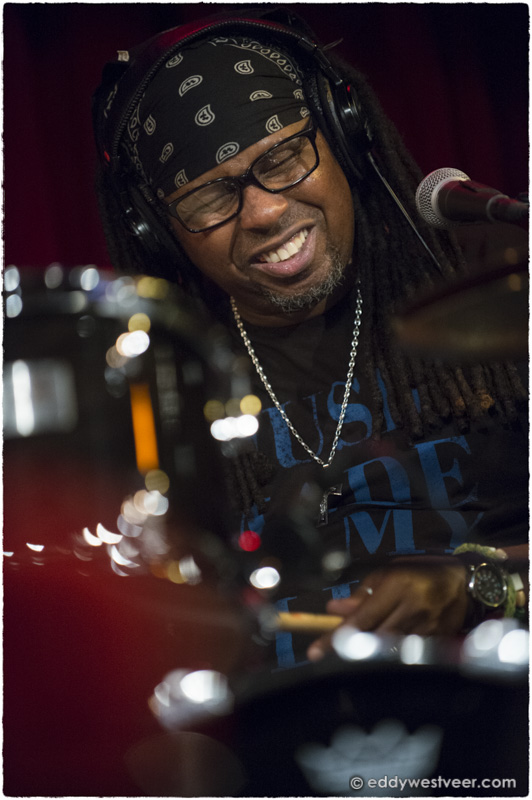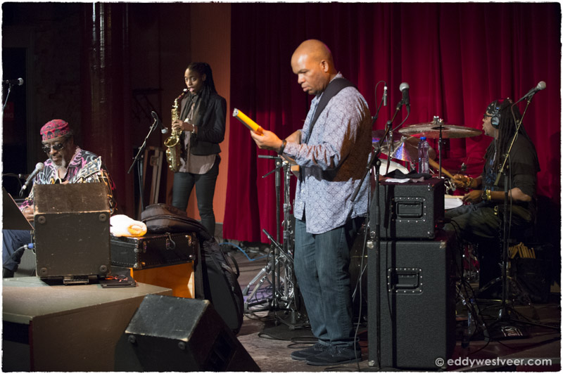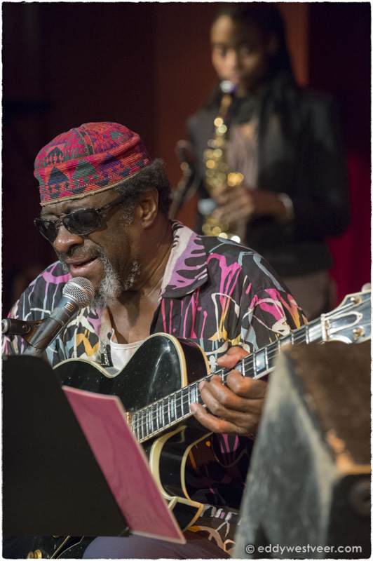 En dat verstoorde de geluidbalans in eerste instantie wat. In combinatie met het wah-wahpedaal dat Ulmer continu gebruikte en de losse manier van aanslaan, waarbij wel eens een snaartje extra klonk, werd het gitaargeluid wat zompig en was, afgezien van de afgemeten funkriffs, soms matig te horen wat hij nu precies speelde. En dat wil je wel, want dit is toch een unieke gitarist.