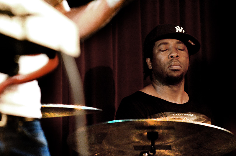 Die laatste is van een loepzuiver karaatgehalte: hij drumt alsof hij in een coffeeshop even wat verpozing zoekt. Op een open manier oogcontact met het publiek zoekend, sloeg hij uiterst ontspannen het ene na het andere adembenemende ritmepatroon. Daarbij aan één stuk schakelend van ingenieus naar architectonisch. Waarmee hij de belangrijkste bouwheer is van dat retestrakke groepsgeluid, waarvan hierboven al sprake was.