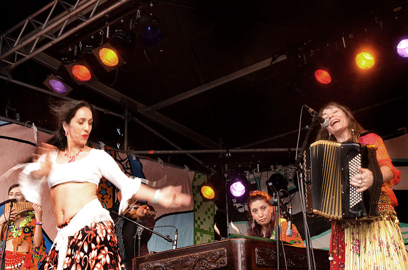 Aantrekkelijk was het optreden van de vrouwengroep Alexandra en Romska Stars. Alexandra staat voor Alexandra Beaujard, die naast accordeoniste ook actrice en zangeres is. Bandleden voerden als ze even geen zin hadden om te spelen, aan de rand van het podium fraaie buikdansacts op. Het resulteerde in alweer opzwepende muziek, aangevoerd door een rondzingende cimbalon. Het bombardement aan kleuren in de kleding van de Romska Stars plus hun dansverrichtingen, betekenden een prikkelende visuele toevoeging aan dit toch al zo kleurrijke festival.