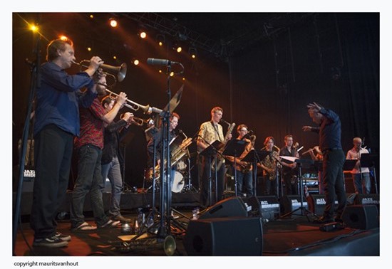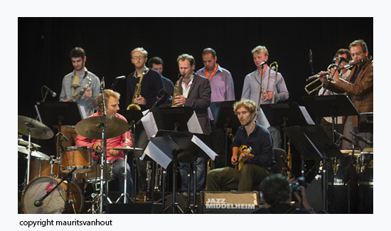 Swing ontbrak vrijwel bij de twee bejaarde Amerikanen, maar die was er wel bij MikMâäk. Het Belgische gezelschap rond tenorsaxofonist Jeroen Van Herzelee en trompettist Laurent Blondiau was getransformeerd in een zeventienkoppige big band. Een heel bijzondere nog wel. Het hele orkest had een dubbele functie. Enerzijds fungeerde het als draagvlak voor de individuele inspanningen, anderzijds als een koor om achter de solisten aan te zingen.