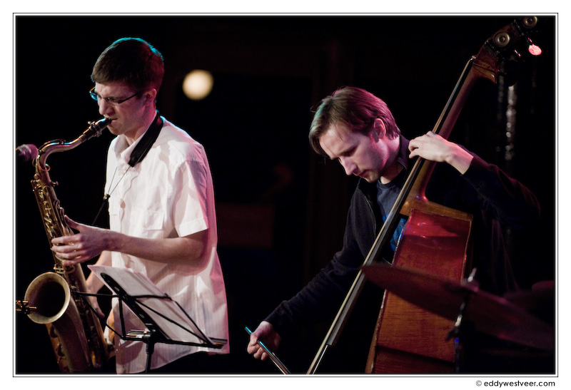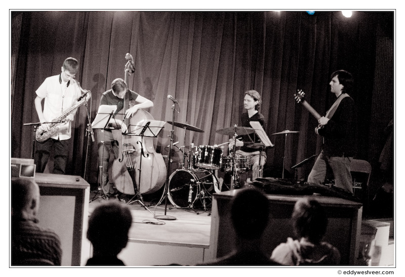 Het programma kende stukken van alle bandleden maar weinig materiaal van het debuutalbum. Een prima balans ook tussen de meer melancholieke, soms dromerige composities zoals ‘Entre les etoiles’ van Verheyen en de up-tempo nummers met onder meer Van der Feen’s swingende ‘Background radiation’. Thema’s lijken soms eenvoudig maar veelal zijn er meerdere structuren door elkaar gevlochten. Zo ook in de meer free en avant-gardistische intermezzo’s. Telkens kozen ze een vorm die hoe dan ook voor alle kwartetleden houvast bood om creatieve uitstapjes te maken. En dat deden ze, veelvuldig, geconcentreerd en met bezieling. Aandoenlijk om te zien hoe ze zich moeilijk een houding wisten te geven na het bijpassende uitgebreide applaus.